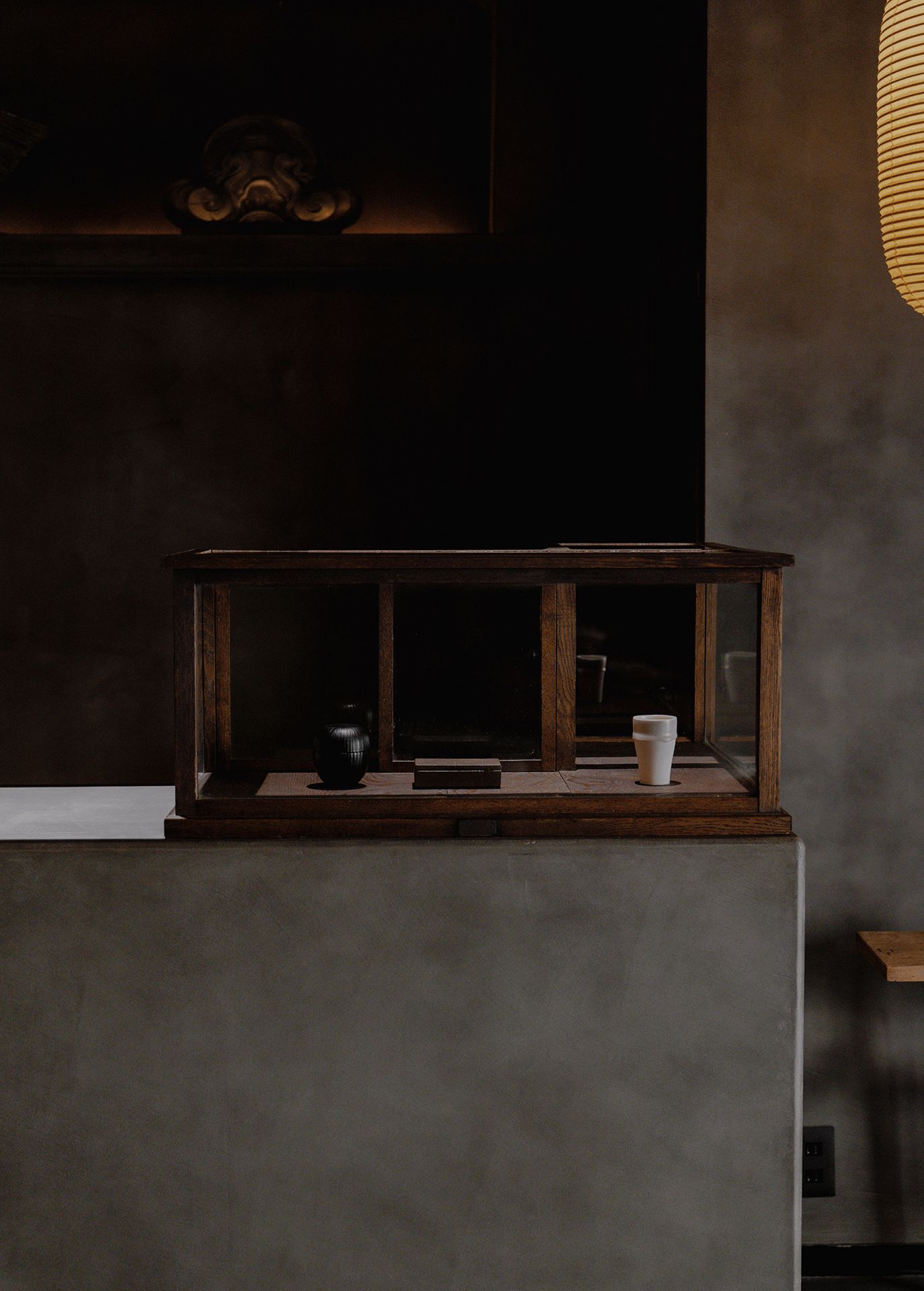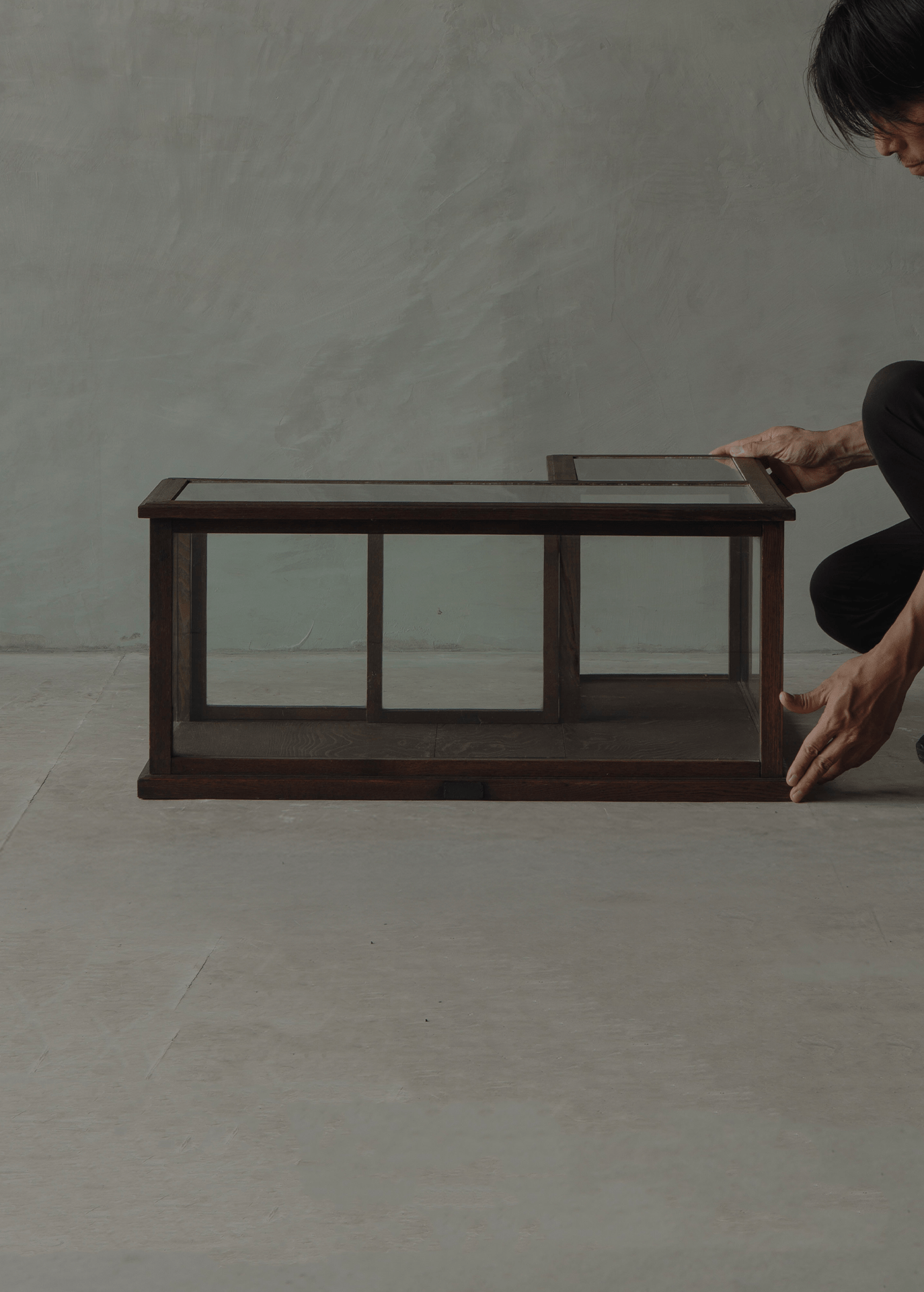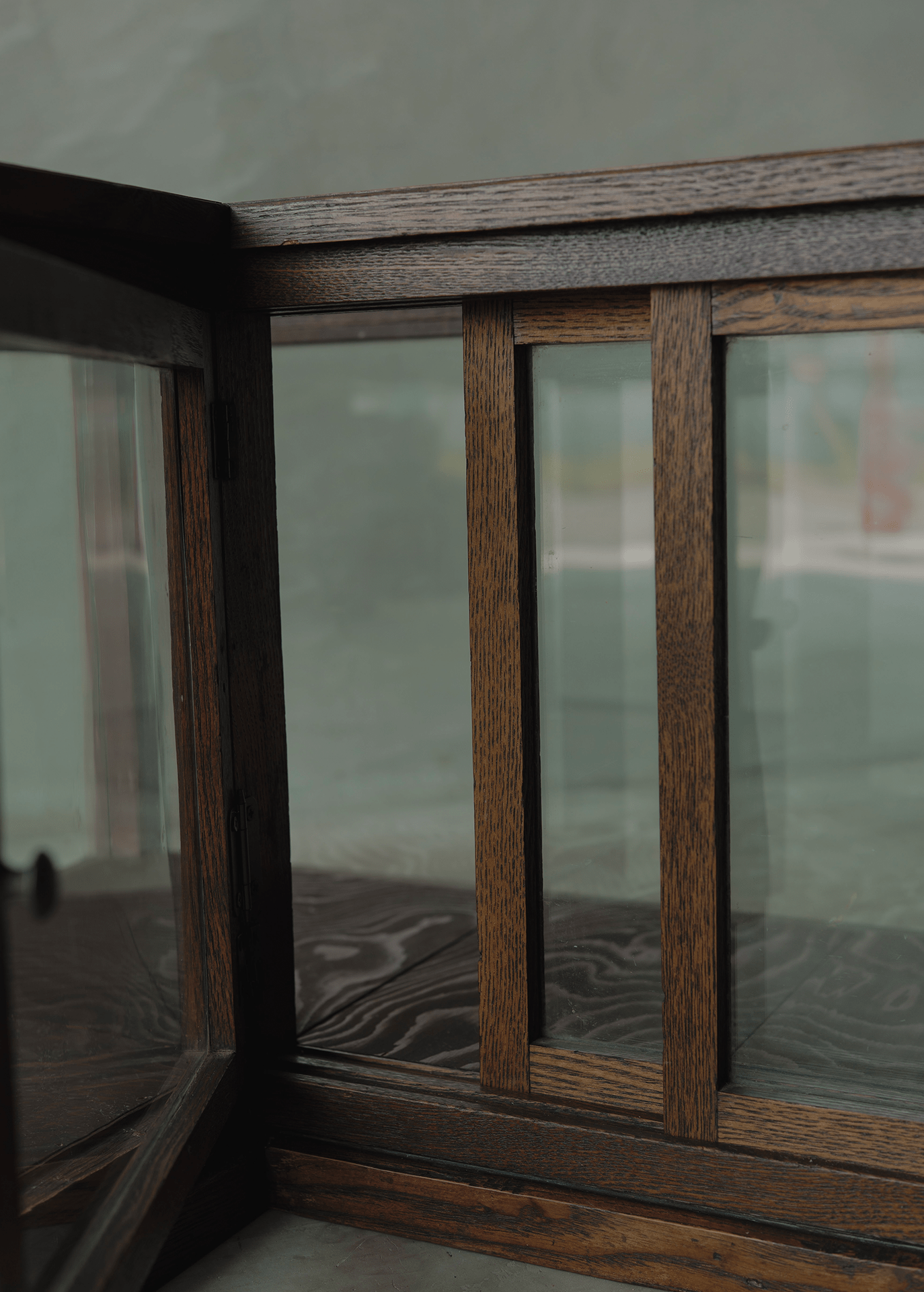 This L-shaped showcase was made in the early Showa period and is made of lacquered oak wood.