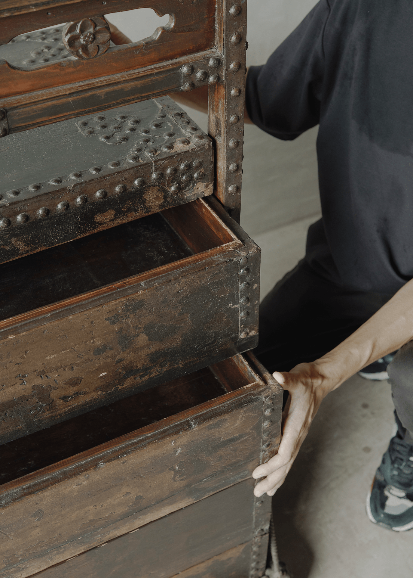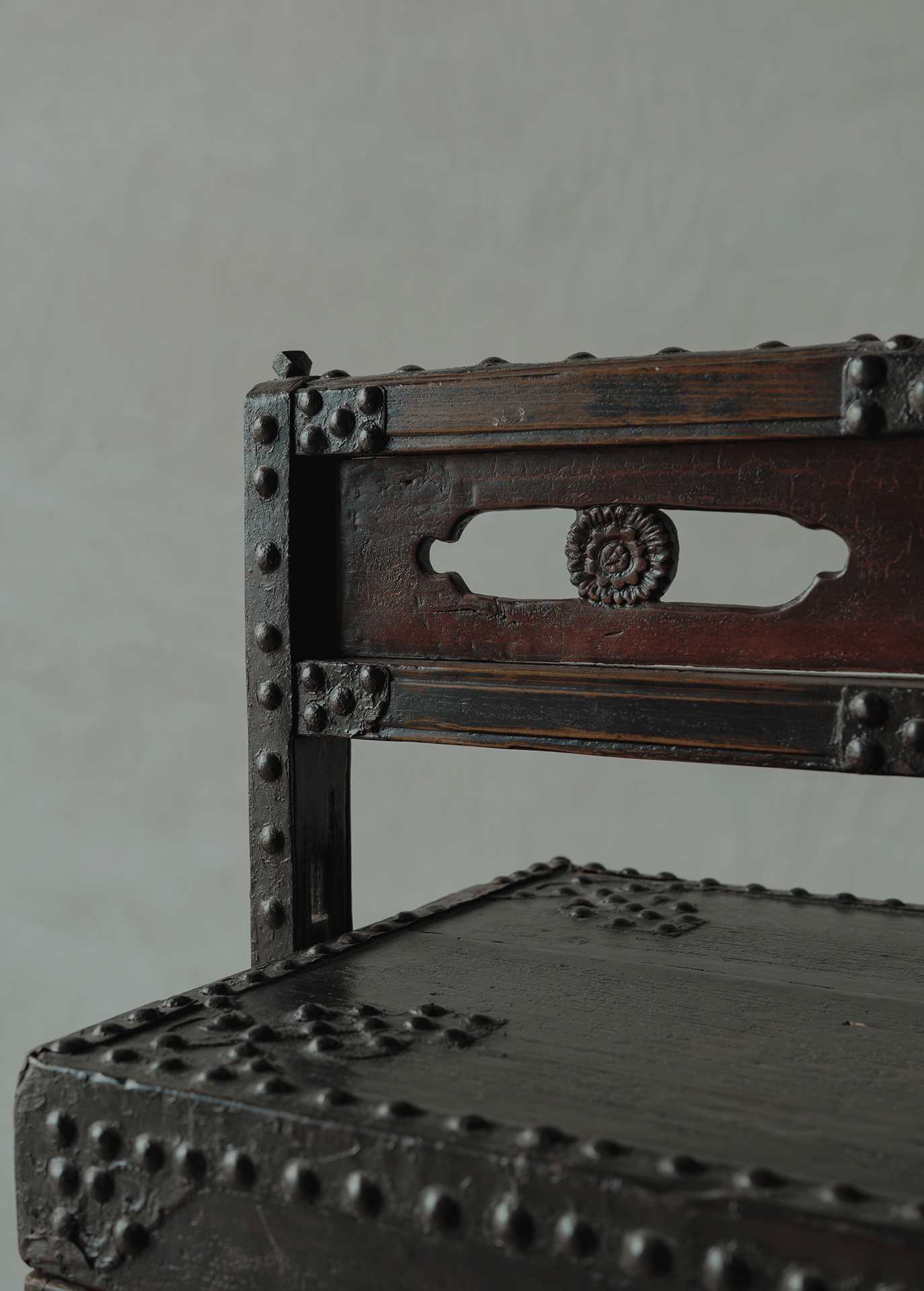 The countless rivet decorations that surround the sturdy wooden base strongly reflect the craftsmanship of Southeast Asia and convey the atmosphere of trade at the time.