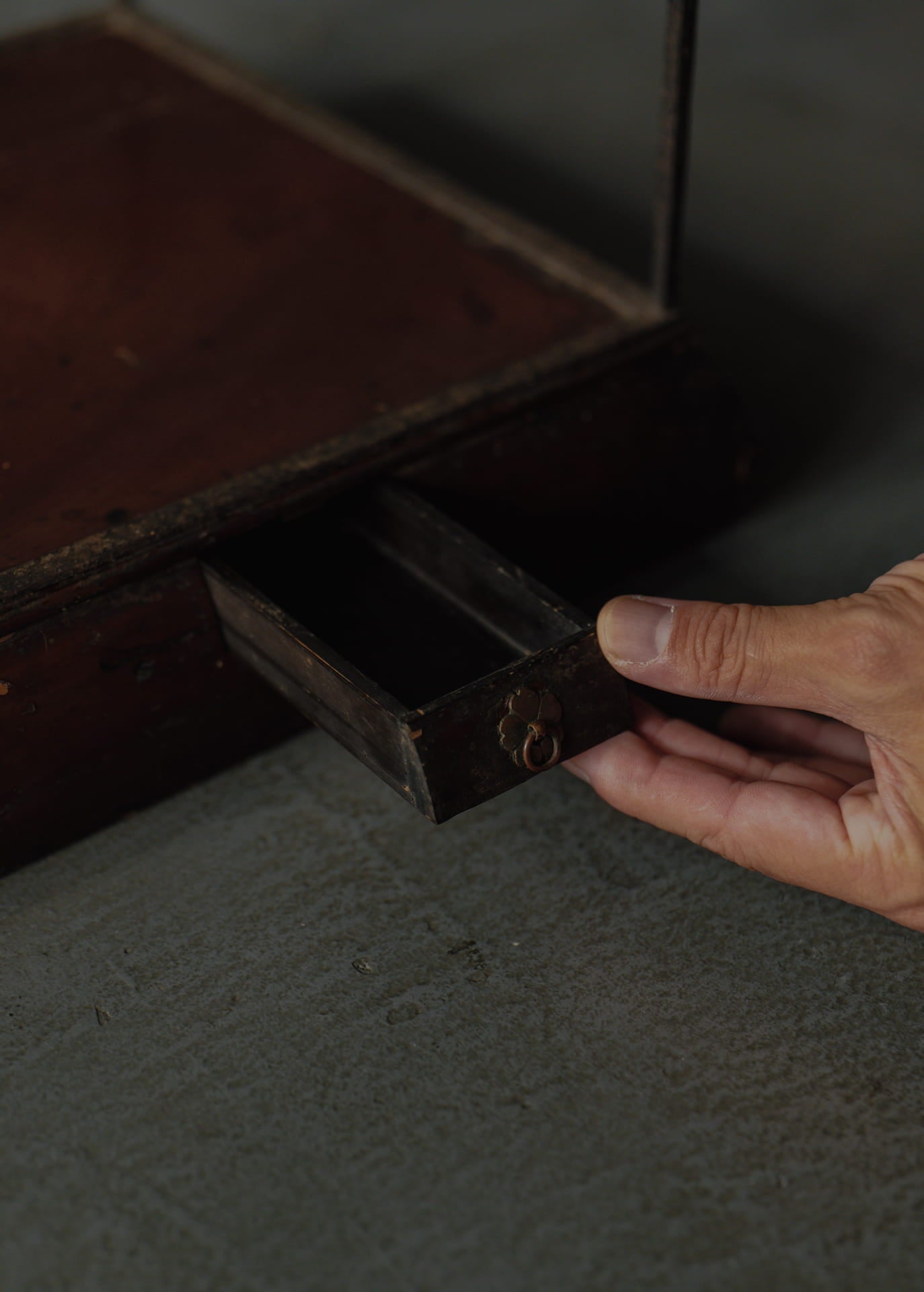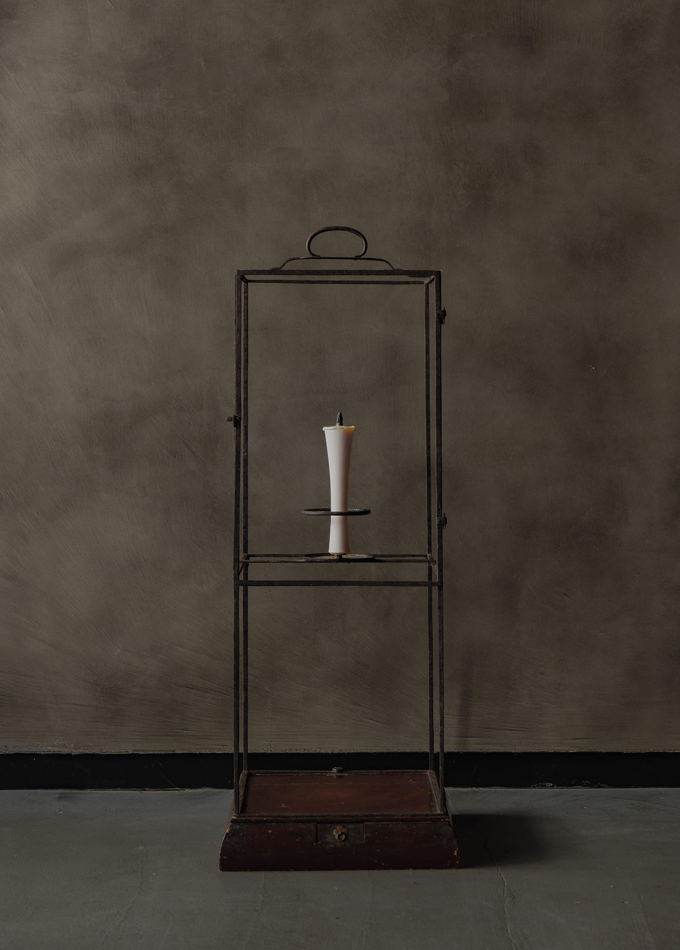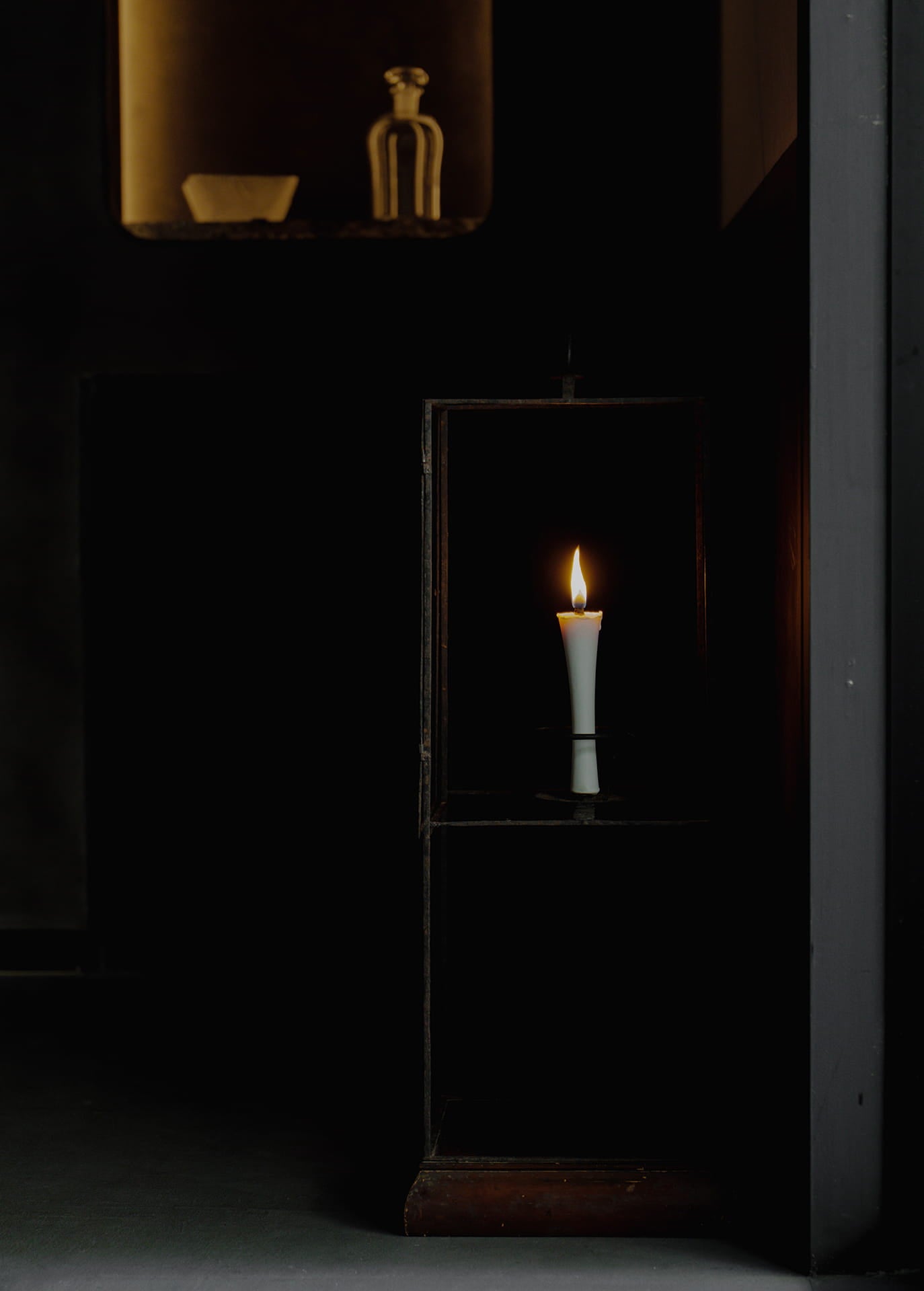 台座の引き出しには予備の蝋燭や芯切り鋏を納めることができ、先人の暮らしの知恵をそのままに愉しめる実用性も備えています。唯一無二の稀少な一点物として、あなただけの夜を豊かに彩る一生の伴侶に。炎の揺らぎと共に流れる贅沢な時間を、ぜひお手元でご体感ください。