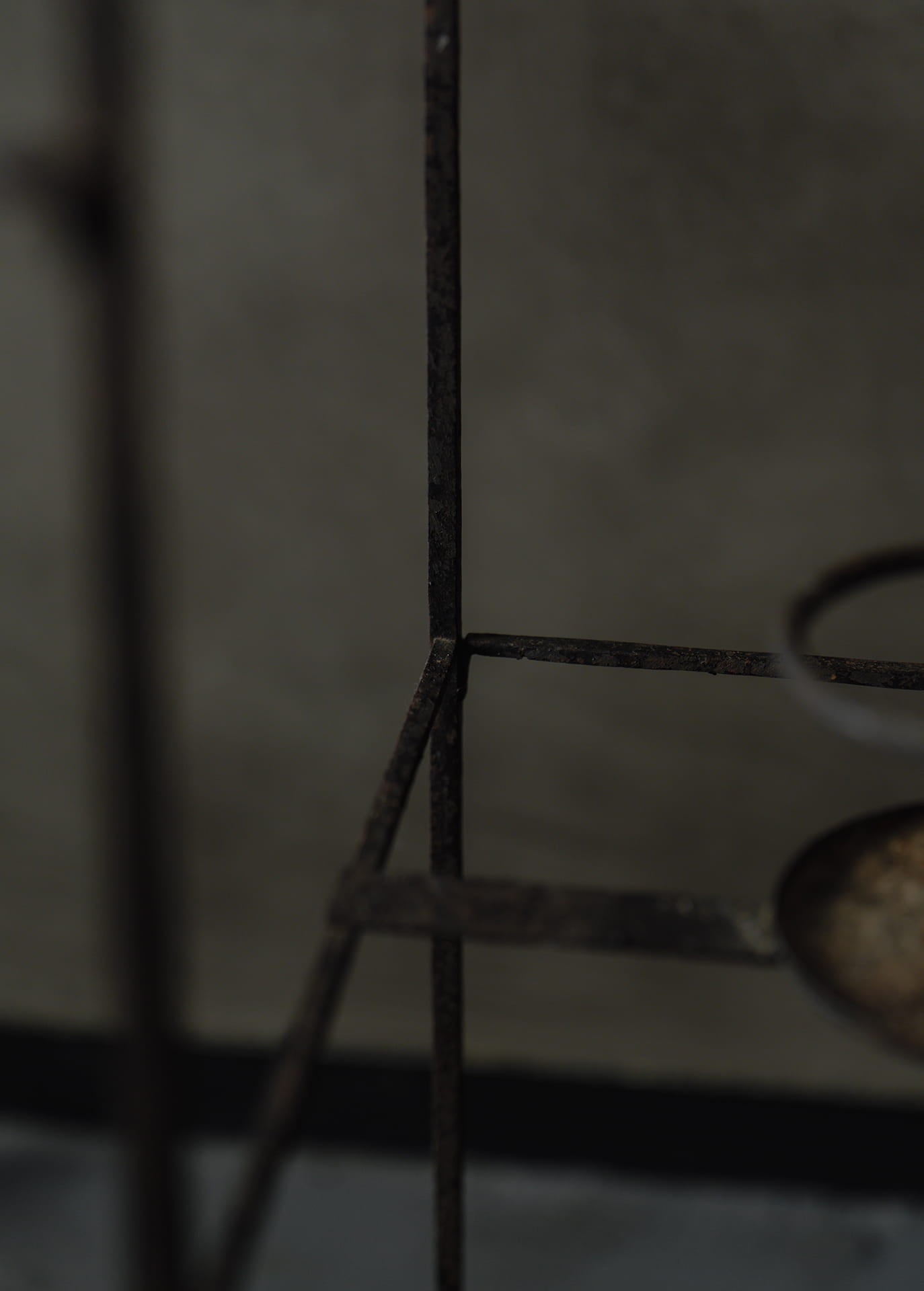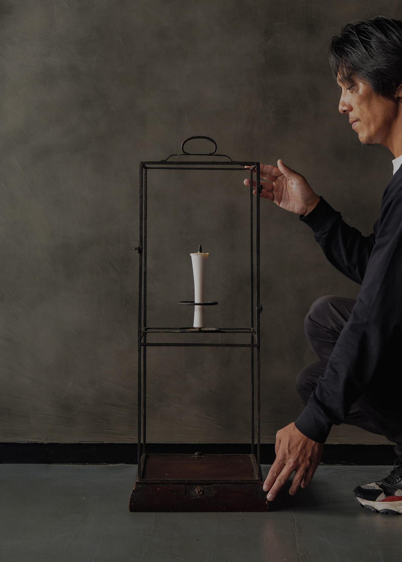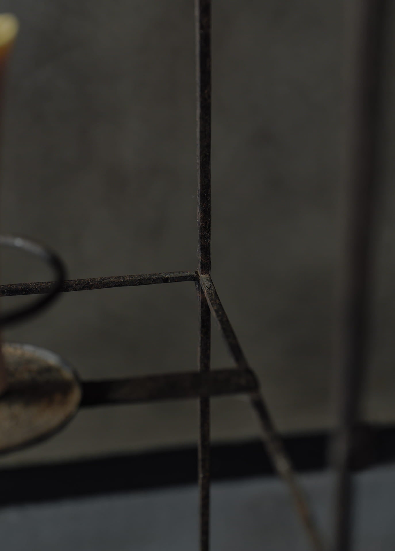 この行燈の真価は、火を灯した瞬間に立ち現れます。 あえて和紙を介さず、剥き出しの鉄枠としたことで、和蝋燭の炎が放つ「ゆらぎ」は遮られることなく、空間の隅々まで溶け込みます。壁面に映し出される鉄枠の影は、まるで一幅の墨絵のように揺らめき、見慣れた居室を、一瞬にして深い静謐を湛えた「瞑想の場」へと塗り替えるでしょう。