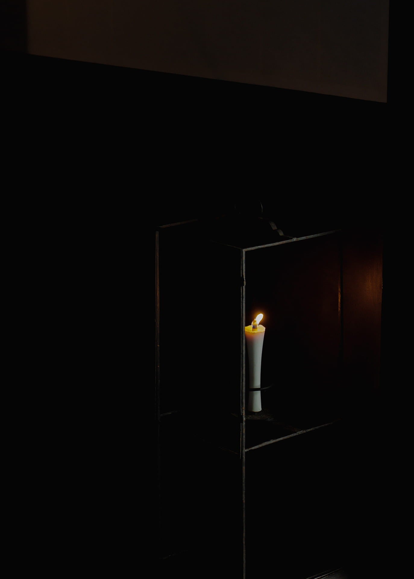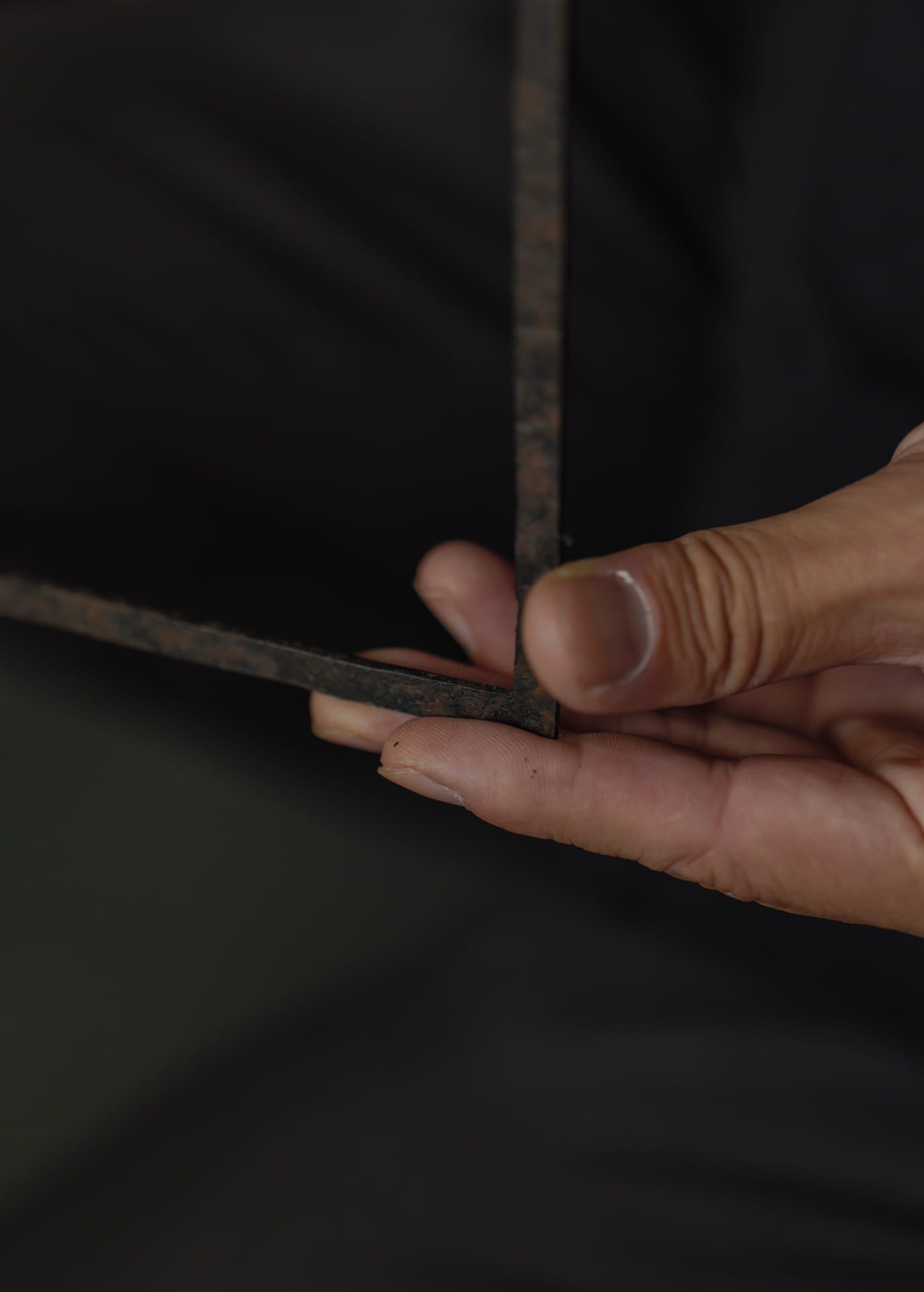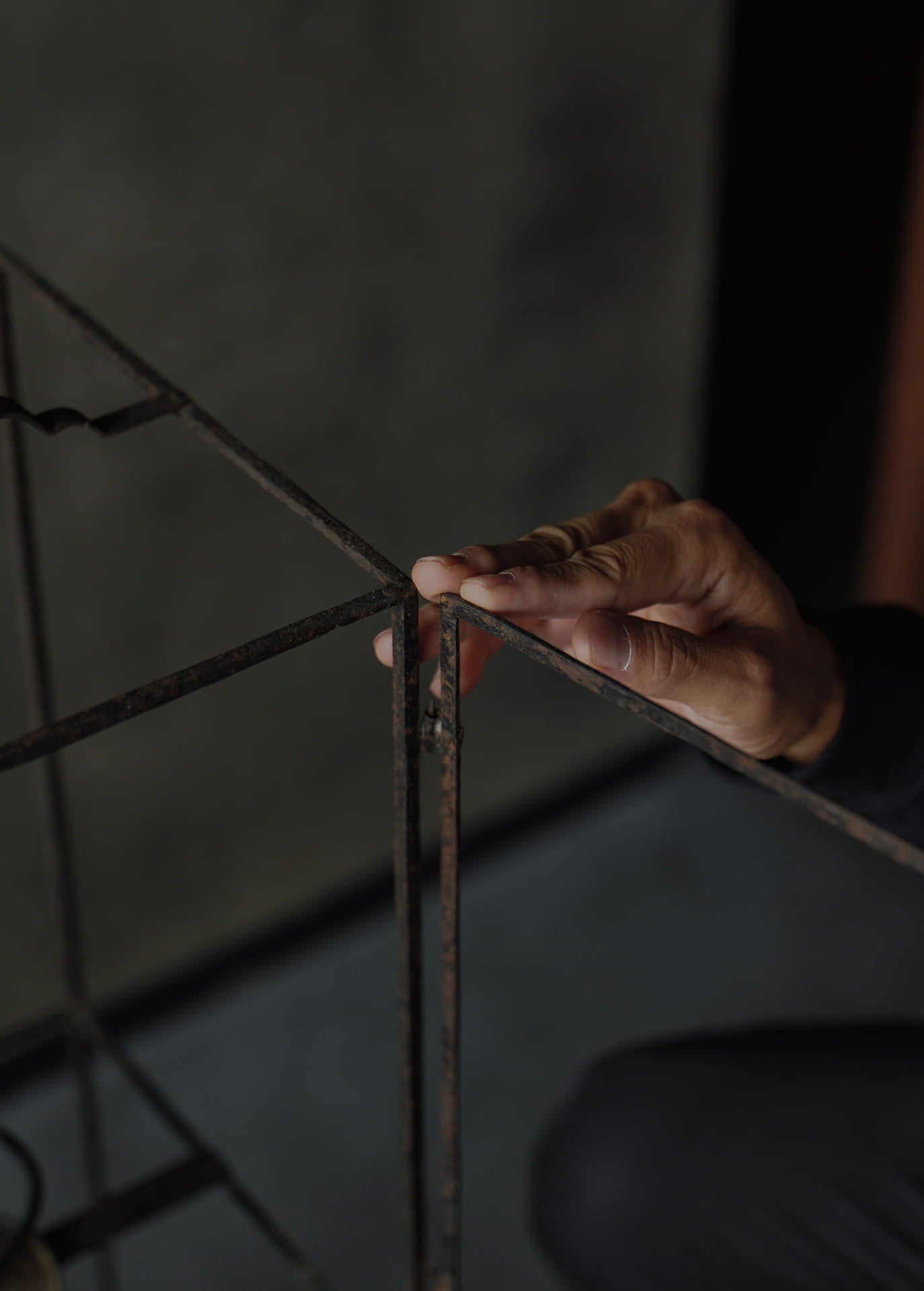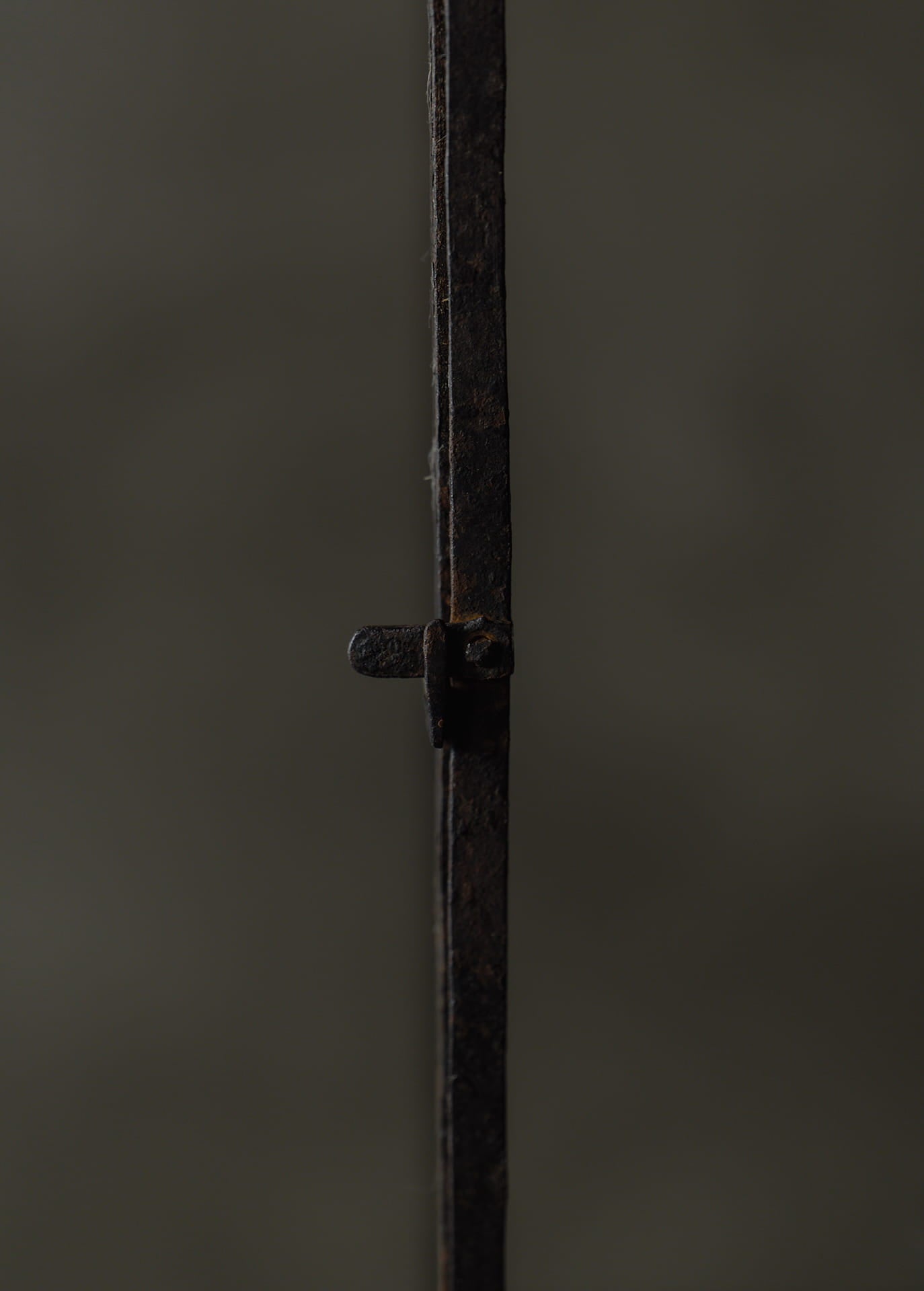 この行燈の真価は、火を灯した瞬間に立ち現れます。 あえて和紙を介さず、剥き出しの鉄枠としたことで、和蝋燭の炎が放つ「ゆらぎ」は遮られることなく、空間の隅々まで溶け込みます。壁面に映し出される鉄枠の影は、まるで一幅の墨絵のように揺らめき、見慣れた居室を、一瞬にして深い静謐を湛えた「瞑想の場」へと塗り替えるでしょう。