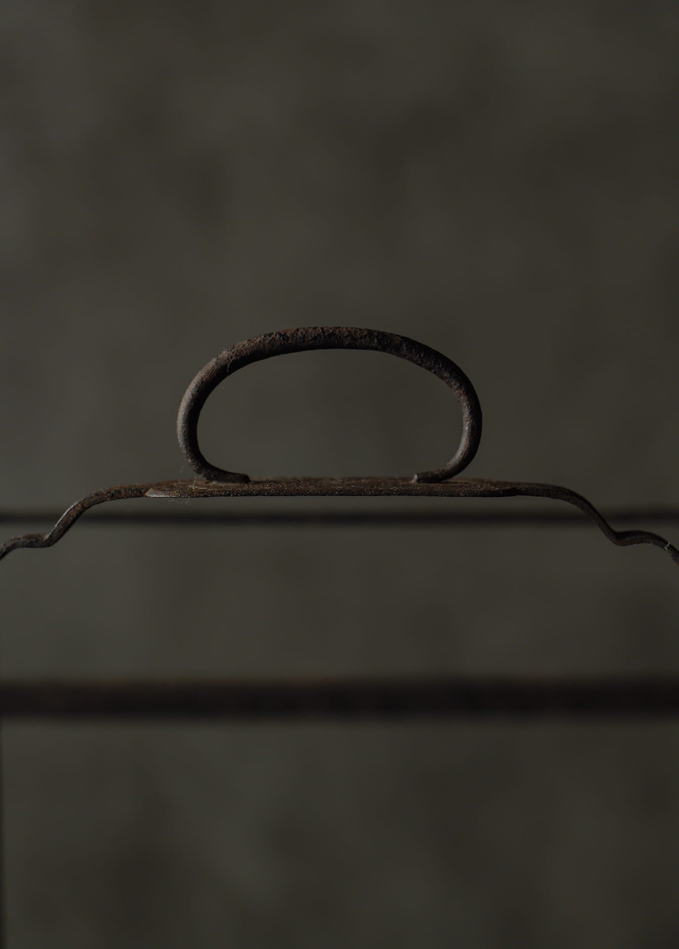 明治から大正へと移ろう時代、日本の夜を支えた実用美の極致がここにあります。かつては和紙を纏い、暮らしを穏やかに包み込んだこの行燈は、長い年月を経てその強固な「骨格」を露わにしました。鍛えられた鉄枠が描く繊細な曲線と、歳月を刻んだ木製台座の重厚な質感。そこには、余分なものを削ぎ落とし、本質だけを残した素の美しさと、時が醸成した侘びの風情が宿っています。