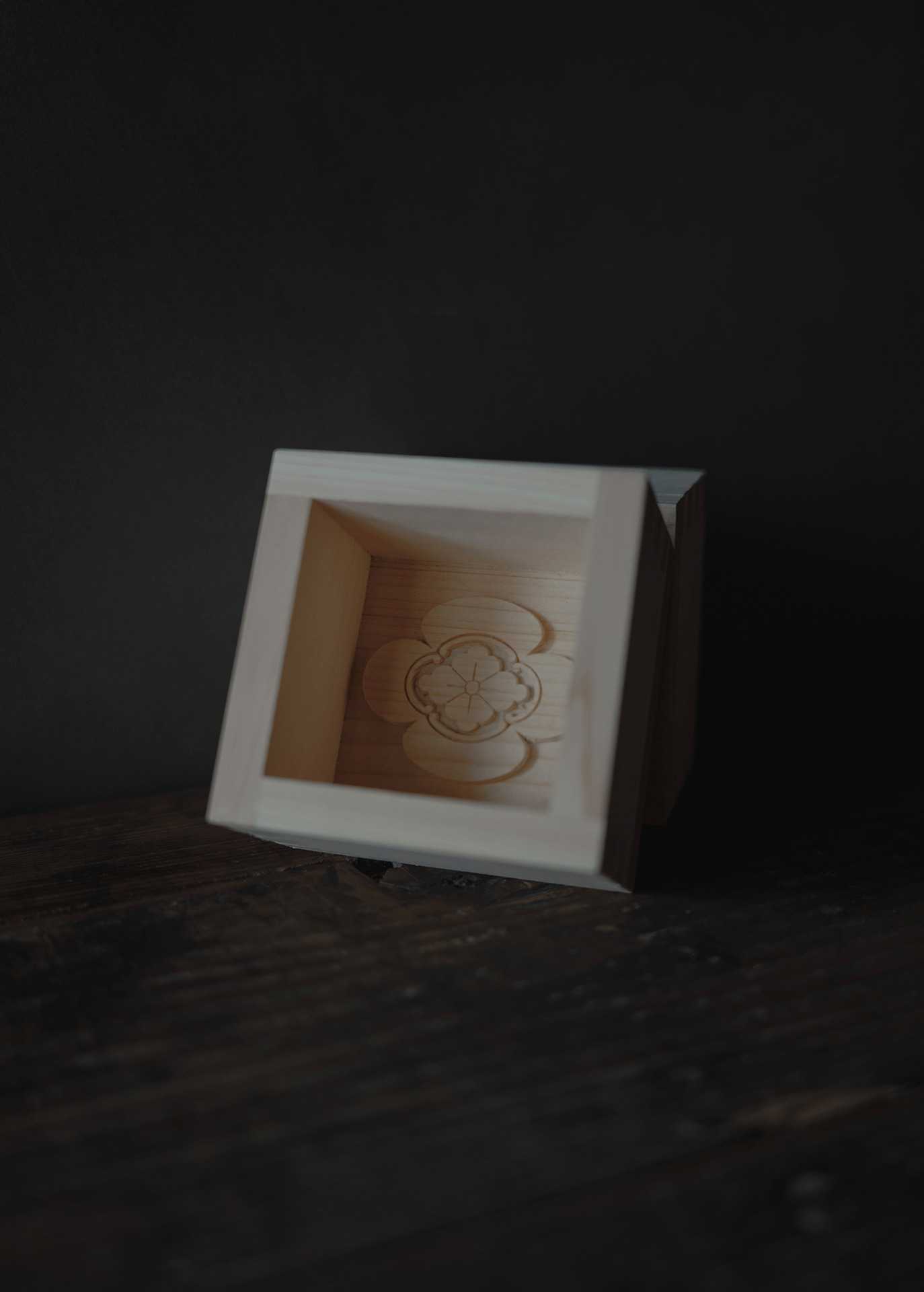 彫刻師は、祭りで使われる神輿やだんじり、やぐら、太鼓台などの彫刻を手掛けており、神話や戦国絵巻、動植物の縁起物など、生き生きとした動きと繊細な細工を表現。伝統的な木彫技術を活かし、日本人にとっても同じく伝統的な「枡」を一つひとつ手作りで仕上げ、家紋入り彫刻桝/木瓜をご用意させていただきました。